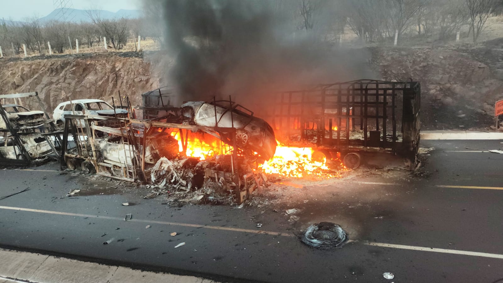 Las imágenes captadas por automovilistas y difundidas en redes sociales mostraban un infierno sobre el asfalto, estructuras calcinadas, llamas que alcanzaban varios metros de altura y una columna de humo visible a kilómetros de distancia.