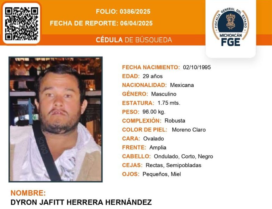 Morelia, Mich.-Este miércoles 7 de mayo, se cumplió un mes de la desaparición de Dayron Jafí Herrera Hernández, joven moreliano que fue visto por última vez a las afueras del salón de fiestas “La Casa de Sam”, al norte de la capital michoacana. Su madre, Evelyn Herrera, denunció públicamente la falta de avances en la investigación por parte de la Fiscalía General del Estado de Michoacán (FGE) y pidió el apoyo de la ciudadanía y los medios para localizarlo.