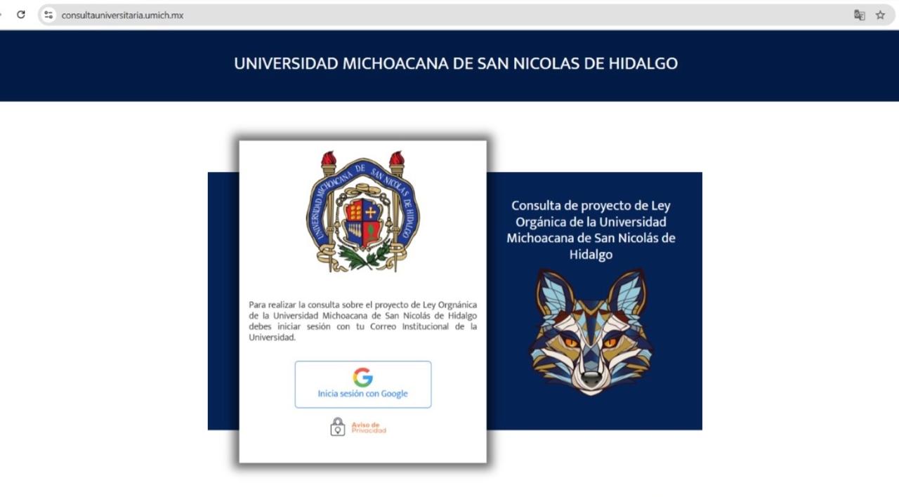 Tras la aprobación del Consejo Universitario, la comunidad nicolaita tendrá a partir de hoy y hasta el próximo lunes 24 de febrero para ingresar a la plataforma a través de su correo electrónico institucional mediante el enlace que ya fue enviado a la totalidad de estudiantes, docentes y al personal administrativo, de igual forma, podrán acceder desde la siguiente dirección electrónica: https://consultauniversitaria.umich.mx, en donde deberán ingresar su correo, para posteriormente confirmar los términos y condiciones.