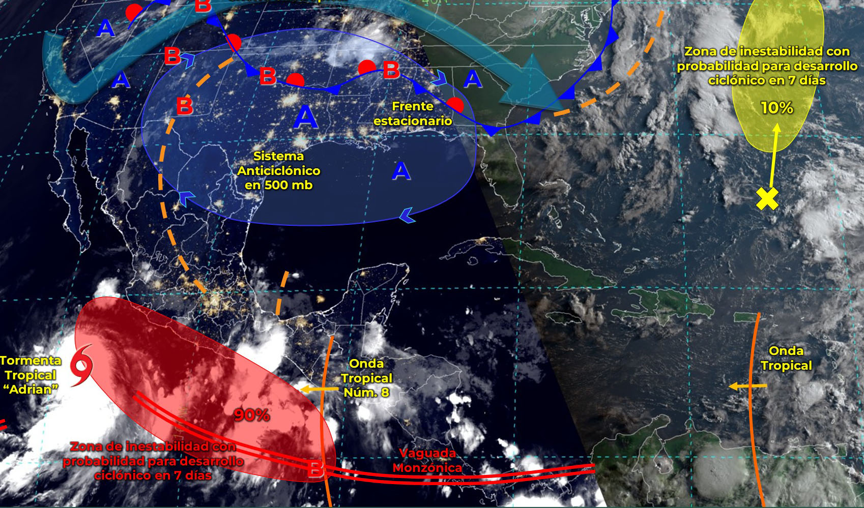 El Servicio Meteorológico Nacional (SMN) pronosticó que este miércoles la tormenta tropical “Adrián” podría evolucionar a huracán de categoría 1 en la escala Saffir-Simpson mientras se aleja de costas mexicanas.