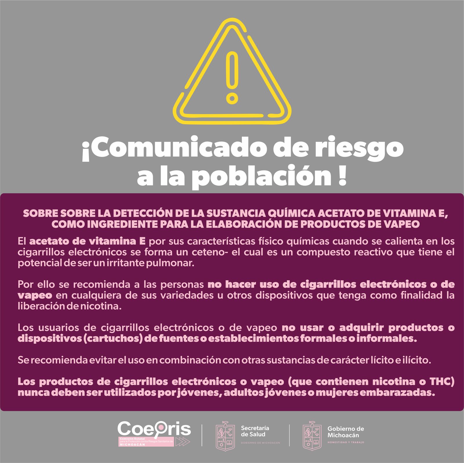 Morelia, Michoacán.- La Comisión Federal para la Protección contra Riesgos Sanitarios (COFEPRIS) a través de la Comisión Estatal para la Protección contra Riesgos Sanitarios (COEPRIS), alertan a la población sobre el uso de cigarrillos electrónicos y vapeadores, tras detectarse la sustancia química acetato de vitamina E, en la elaboración de estos productos.