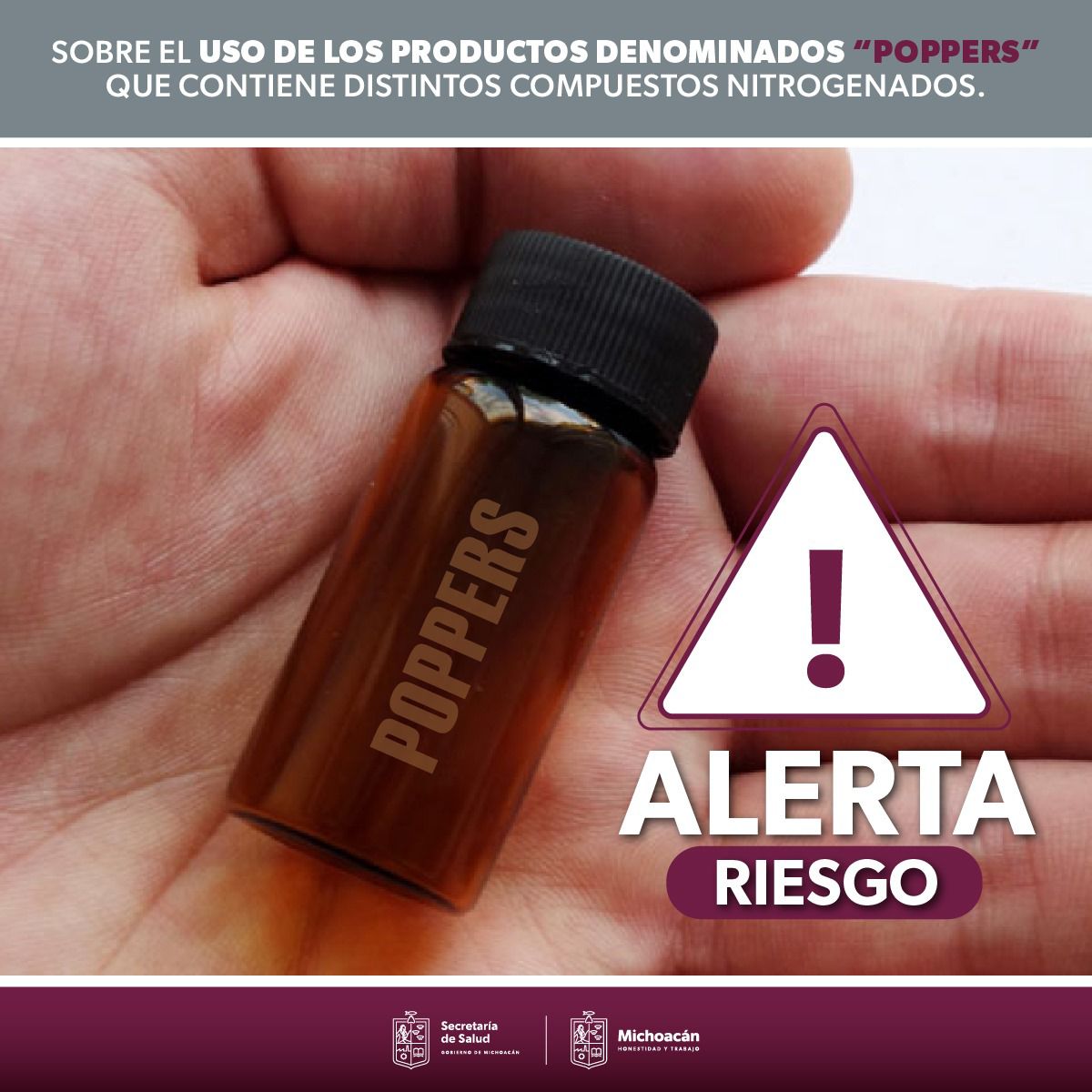 Morelia, Michoacán.– La Comisión Federal para la Protección contra Riesgos Sanitarios (Cofepris), a través de la Secretaría de Salud de Michoacán (SSM), alerta a la población sobre el uso de productos denominados “poppers”, los cuales contienen compuestos nitrogenados como el nitrito de amilo, isobutilo, isopropilo o butilo, sustancias consideradas tóxicas para el cuerpo humano.