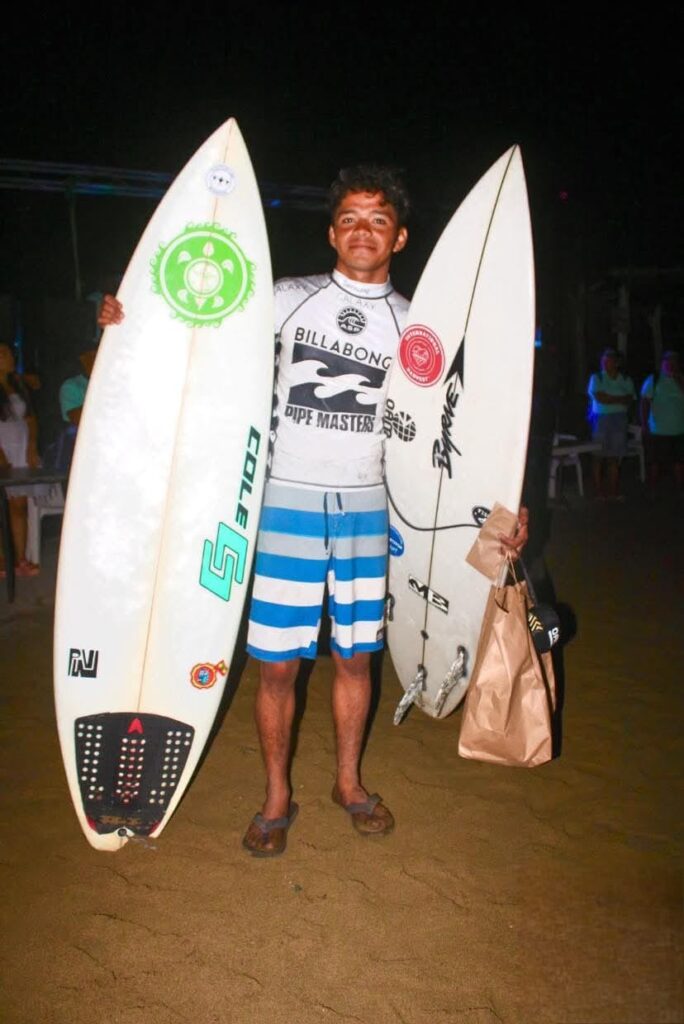 Aquila, Michoacán.- Francisco Carreón Arroyo, estudiante del plantel Colola del Colegio de Estudios Científicos y Tecnológicos del Estado de Michoacán (Cecytem) ganó primer lugar en la categoría local, en el Torneo de Surf “La Ticla” que se realizó el día de ayer 19 de abril en Aquila.
