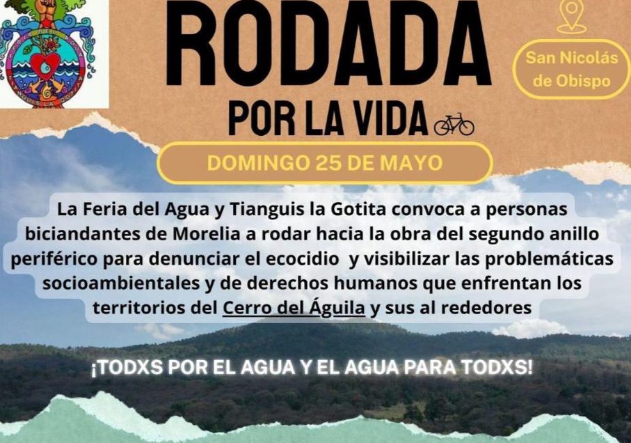 La Feria del Agua y Tianguis la Gotita en conjunto con activistas y defensorxs de la vida convocan a personas biciandantes de Morelia y a todxs aquellxs interesados en participar en la Rodada Por La Vida, con la que buscan denunciar el ecocidio cometido por la obra del segundo anillo periférico promovida por el gobierno del estado, y para visibilizar el conjunto de las problemáticas socioambientales, económicas y de derechos humanos que enfrentan las y los pobladorxs de los territorios alrededor del Cerro del Águila.