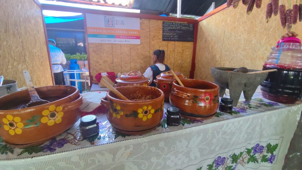 “Estoy ofertando que venga a probar lo que traigo de la meseta purhépecha, como es el churipo con corundas, es el platillo de la casa; el churipo y las corundas de ceniza, también les traemos las gorditas y los taquitos de aporreadillo, de requesón y varios guisaditos, los atoles que son espesados con maíz rojo, el maíz morado, el de tamarindo, traemos el atole de pinole y el negro”.