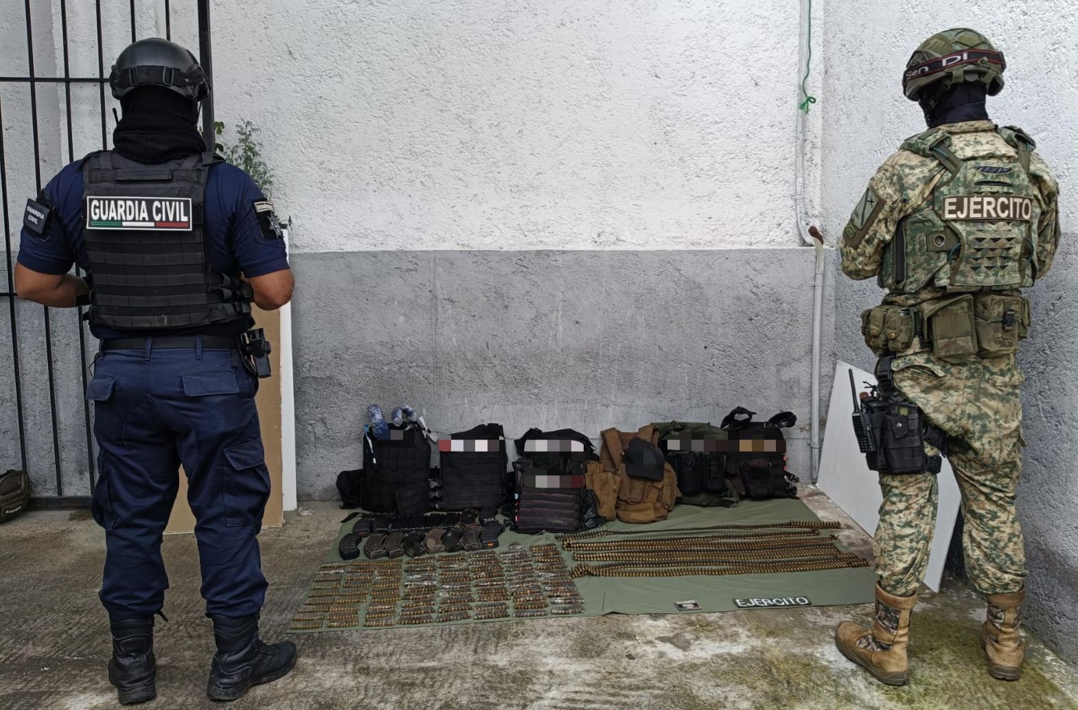 Tras implementar la búsqueda de los presuntos responsables, las fuerzas de seguridad hallaron en un predio siete chalecos tácticos con siglas alusivas a una célula delincuencial, así como los mil 410 cartuchos útiles para diferentes calibres.