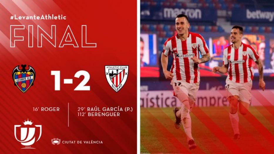 En un partido cerrado de inicio a fin, el Athletic de Bilbao, logró derrotar en tiempos extras 2-1 al Levante, para clasificarse a la gran final de la Copa del Rey.