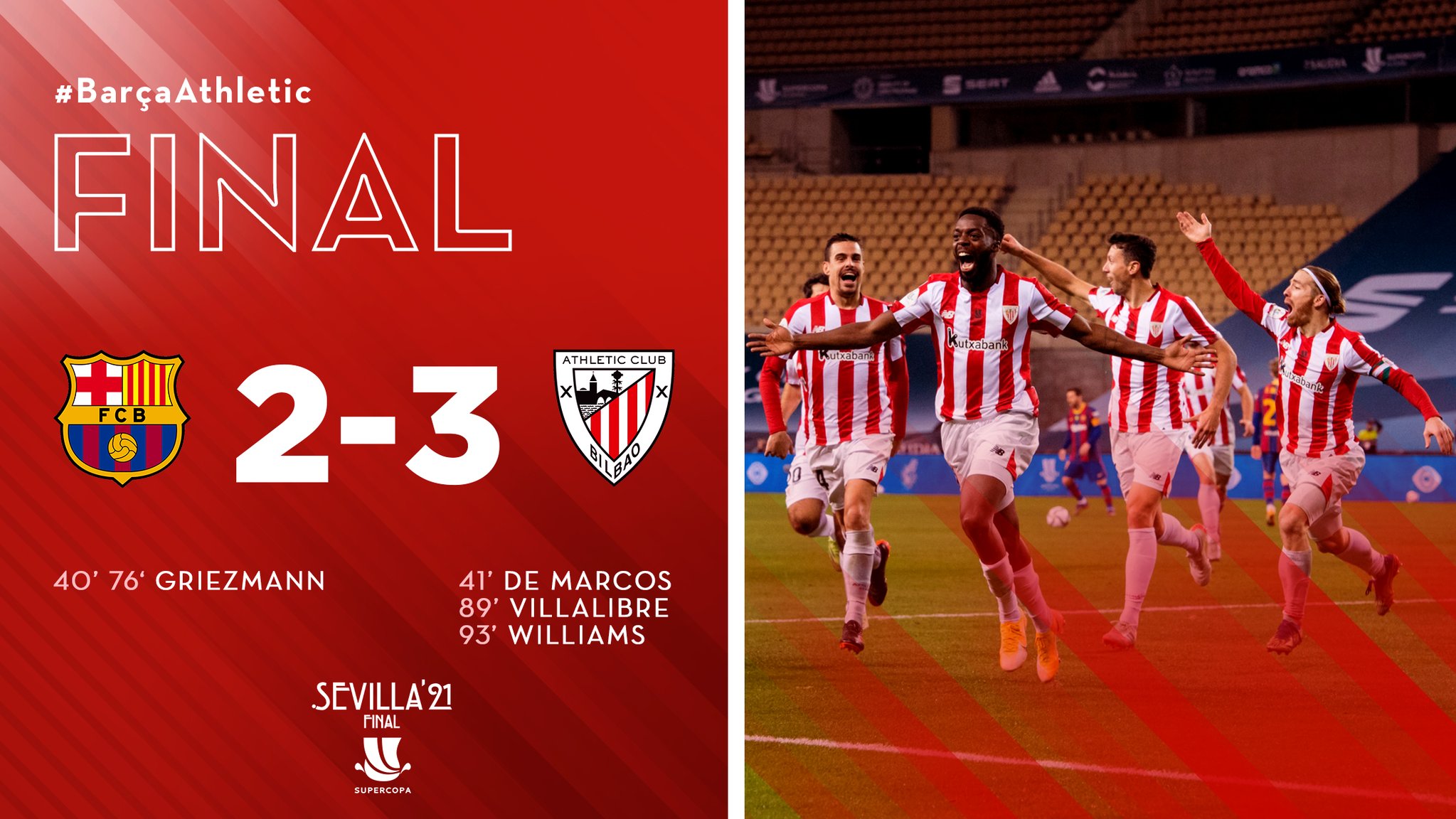 En el alargue, los Leones anotaron rápidamente y al 93, anotaron el tercer gol por medio de Iñaki Williams y de ahí en adelante soportaron los ataques de los Culés, que no pudieron anotar y de esta forma el Athletic de Bilbao conquistó la Supercopa de España.