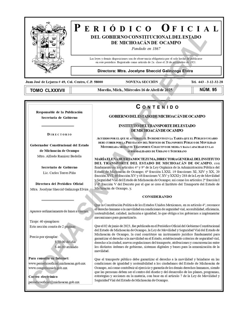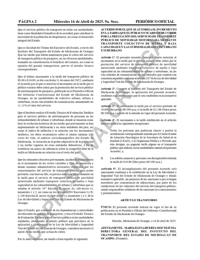 El documento firmado por la titular del Instituto, María Elena Huerta Moctezuma explica que el último aumento se autorizó el 31 de enero del 2022, cuando se incrementó de 9 a 10 pesos, que estuvieron vigentes hasta este martes 15 de abril y señala que el monto autorizado representará un aumento de 11.11%.