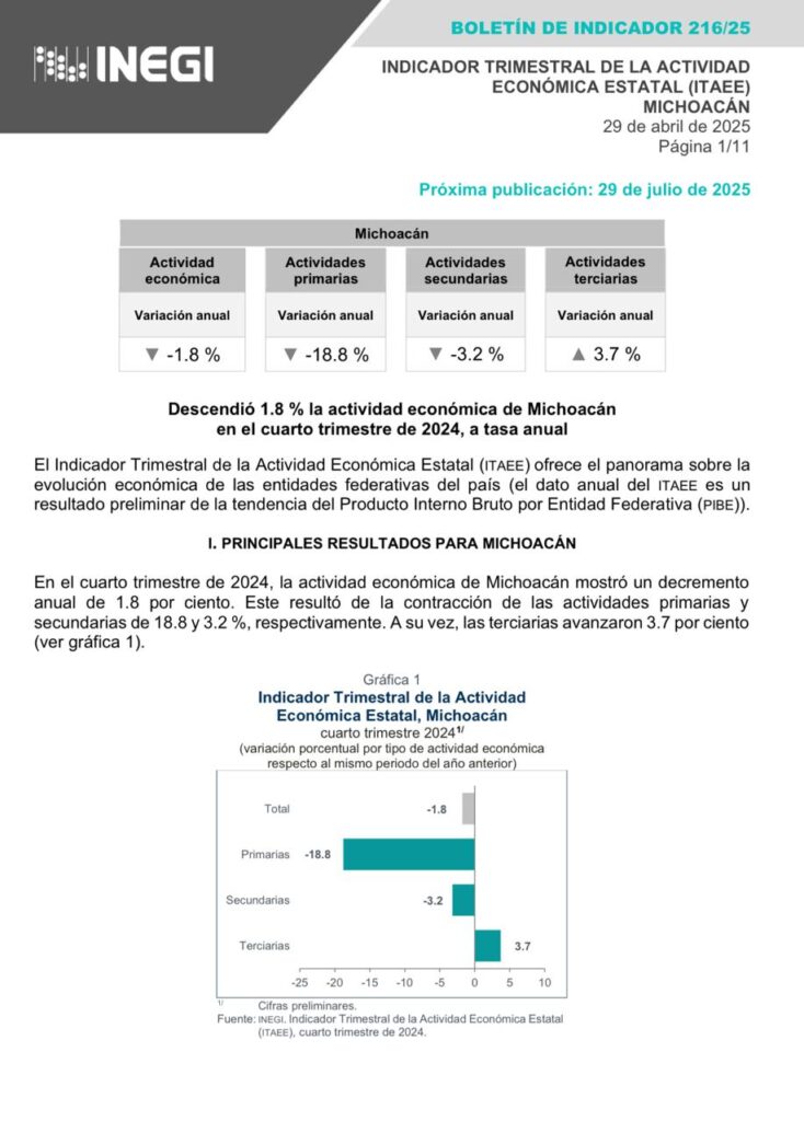 Una disminución de 1.8% en la actividad económica de Michoacán, reportó el Instituto Nacional de Estadística y Geografía (INEGI) al dar a conocer el Indicador Trimestral (ITAEE) en el último trimestre del 2024.