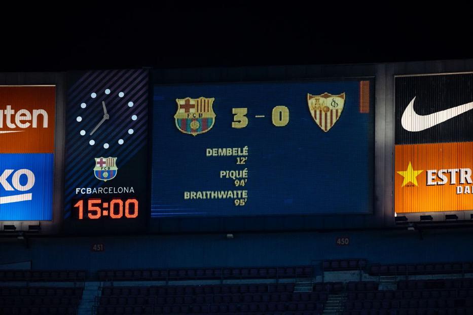 Durante el primer tiempo, el Barcelona se mostró muy superior al Sevilla y a los 12 minutos llegó el primer gol, por medio de Ousmane Dembele, que con un disparo fuera del área comenzó con la remontada.