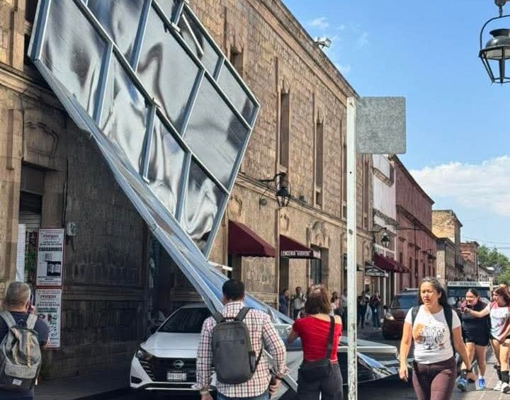 Morelia, Mich.- Derivado de las intensas rachas de viento, una techumbre de aluminio y policarbonto se desprendió de lo alto de una edificación en el Centro Histórico de Morelia y cayó a la avenida Morelos Norte, trascendió en algunos videos difundidos en redes sociales.