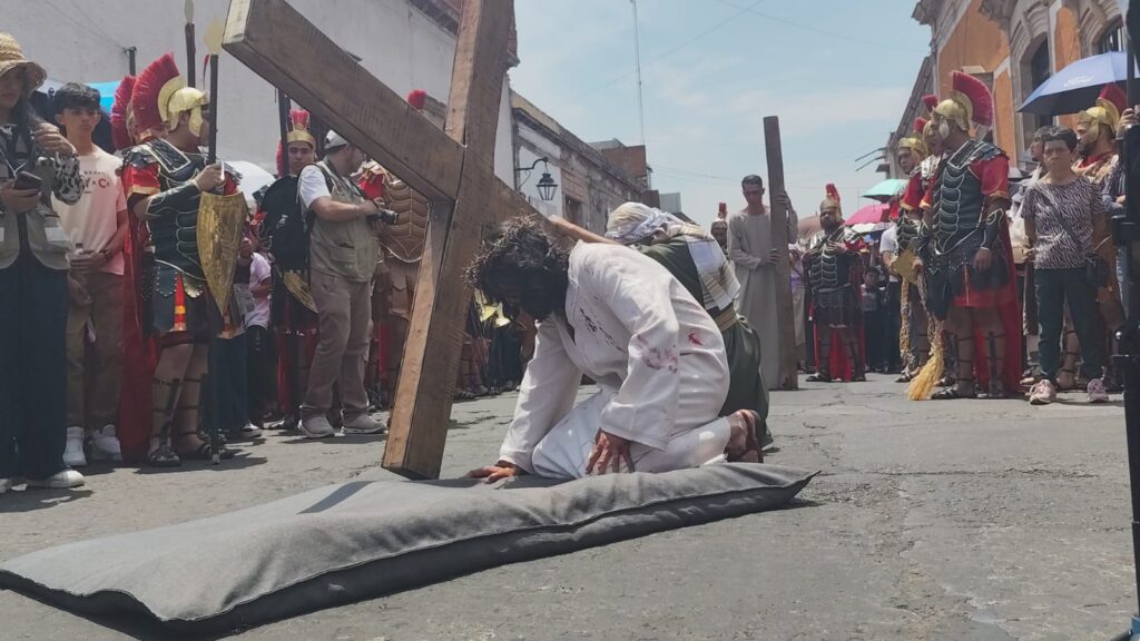 Rodeado por un grupo de jóvenes caracterizados por soldados romanos, Jesucristo escenificó la primera caída apenas unos pasos después del escenario principal, a los minutos se levantó y siguió el recorrido por las calles Zaragoza y 20 de noviembre.