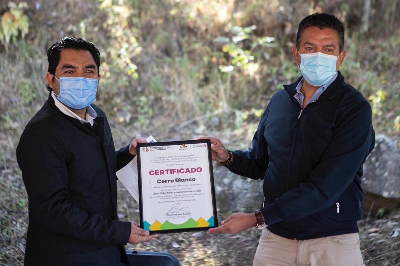 Pátzcuaro, Michoacán, a 19 de diciembre de 2020.- El “Cerro Blanco” ubicado en el municipio de Pátzcuaro, a 2 mil 320 metros sobre el nivel del mar, un sitio representado por vegetación de pino-encino, recibió por parte de la Secretaría de Medio Ambiente, Cambio Climático y Desarrollo Territorial, la certificación como Área Voluntaria para la Conservación que ampara 35 hectáreas, proceso que fue promovido por su propietario Iván Acosta Leal, informó Ricardo Luna García, titular de la Semaccdet durante la entrega del certificado.