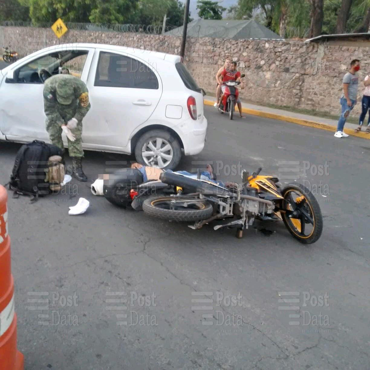 Apatzingán, Mich..- Un hombre resultó lesionado como consecuencia de chocar la motocicleta en que viajaba contra un automóvil en la avenida Francisco I. Madero a la altura del cuartel militar ubicado en la colonia Pénjamo.