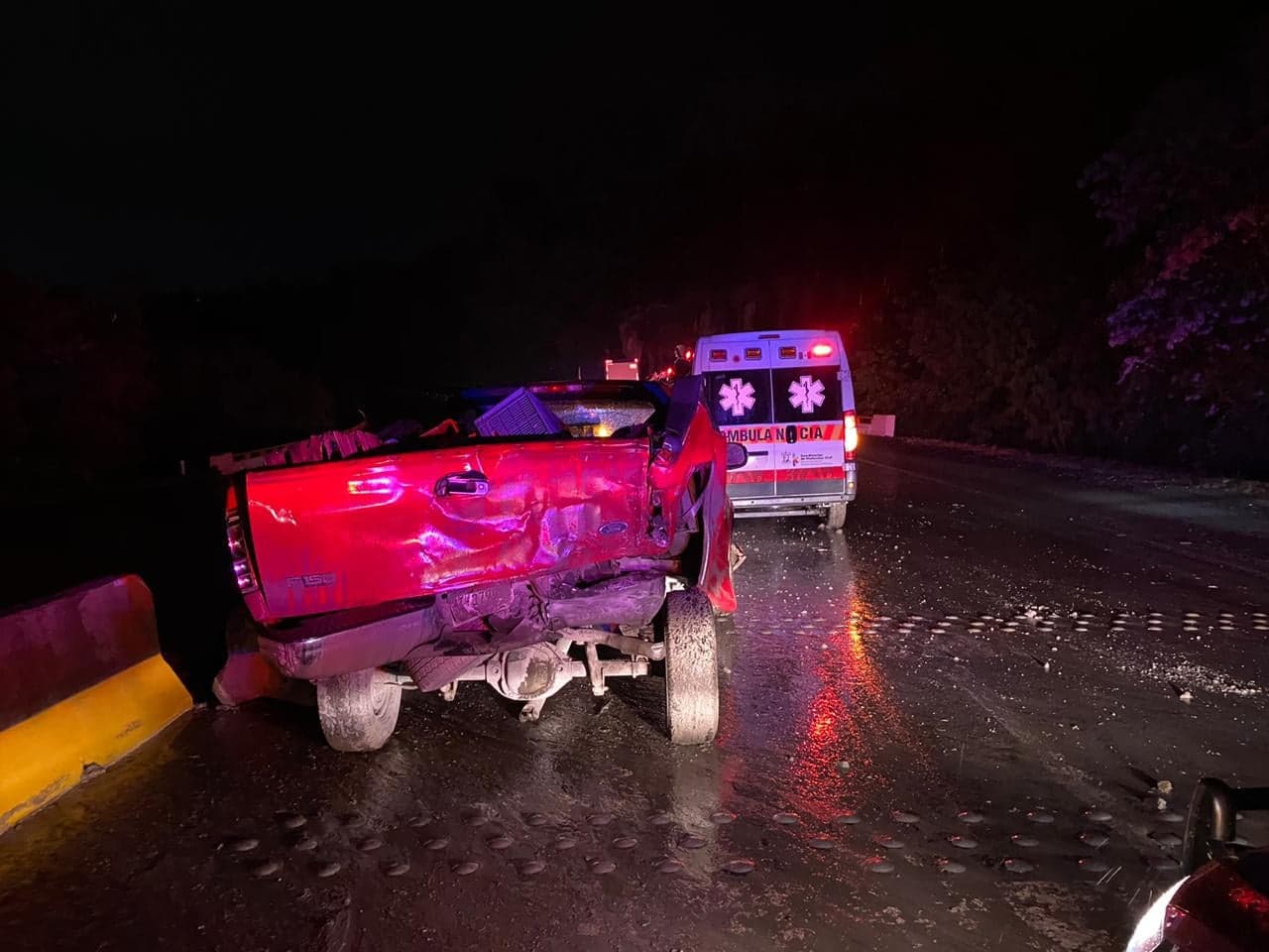 Según los socorristas, sobre el asfalto estaban tirados unos bultos de cemento, lo que probablemente generó el incidente. Se apreció que uno de los automotores involucrados es de la marca Ford F150, color rojo. También una camioneta gris oscuro quedó perjudicada, al igual que un auto blanco.