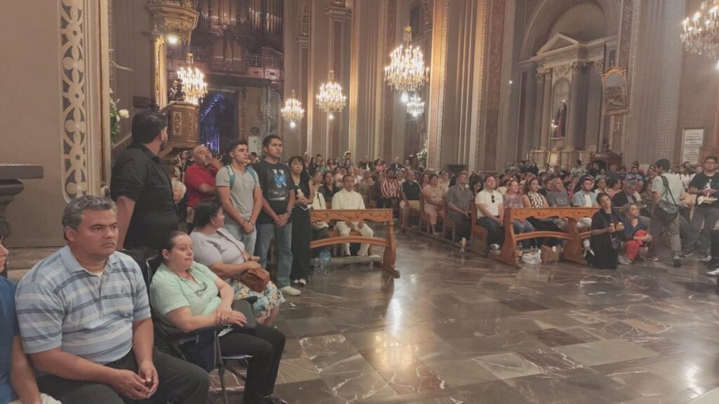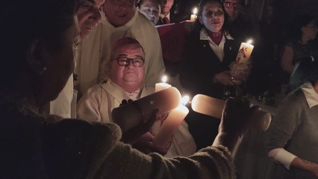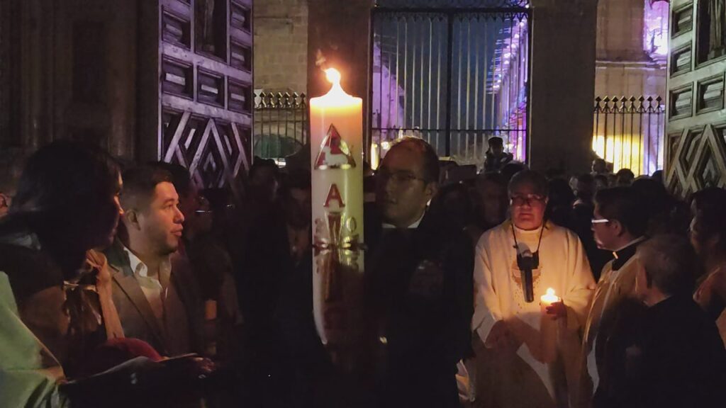 El “Fuego Nuevo” pasó de mano en mano y fue iluminando poco a poco la Catedral de Morelia, donde cientos de fieles católicos participaron este sábado por la noche en la Solemne Vigilia Pascual, con la que se celebró la resurrección de Jesucristo, en ceremonia encabezada por el arzobispo Carlos Garfias Merlos.