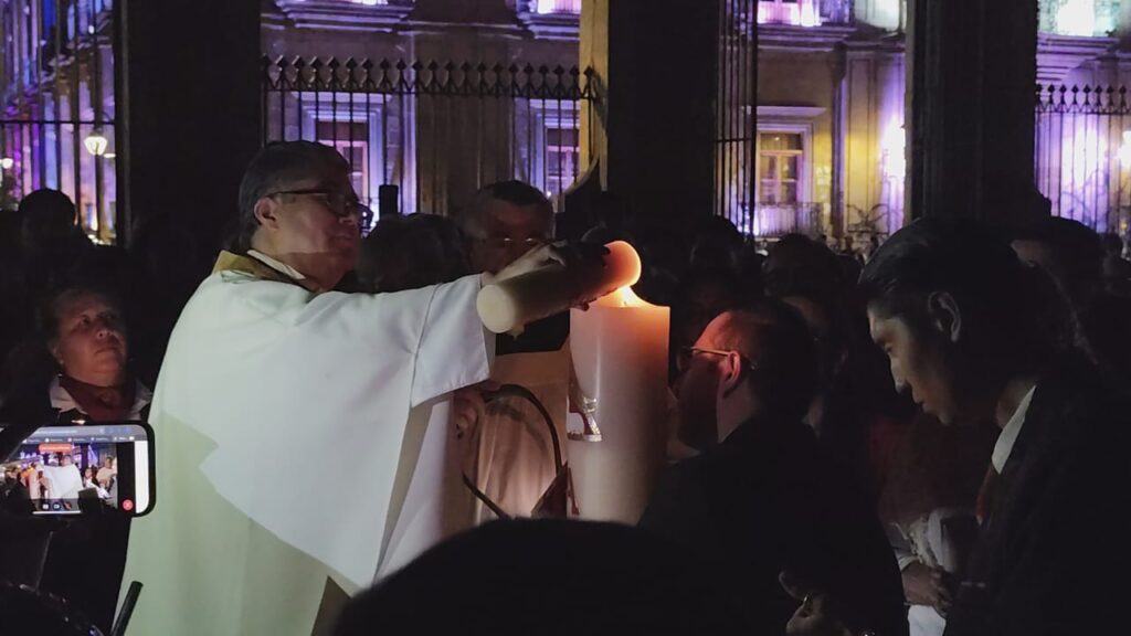 El Cirio Pascual, símbolo de Cristo Resucitado, fue bendecido por el rector de la Catedral, Juan Manuel Quiroz, quien cumplió con el rito y lo encendió en la puerta central del recinto religioso, que fue abierto de manera especial para esta fecha.