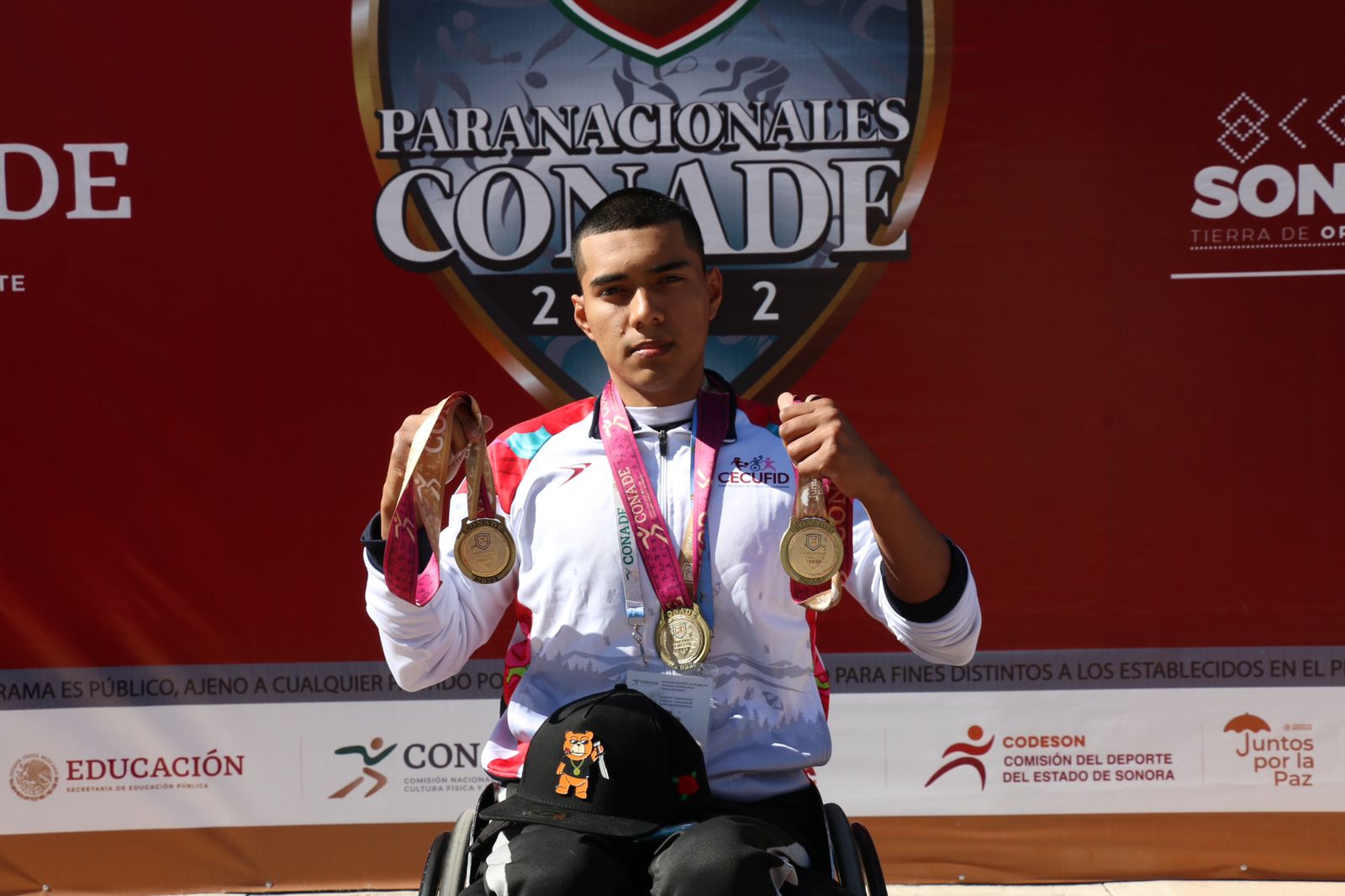 Miguel Ángel Medina Florián, fue el encargado de entregar el último oro al representativo estatal en la prueba de 400 metros T53 categoría Juvenil Superior, con un tiempo de un minuto y 7 segundos y 23 centésimas, para de esta manera asegurar su tercer oro de la justa.