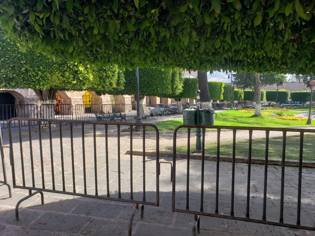 Morelia, Michoacán, Como parte de las medidas preventivas para contener la propagación del COVID-19, elementos de la Secretaría de Seguridad Pública (SSP), realizaron la instalación de vallas metálicas en plazas públicas de la zona centro de esta capital michoacana.
