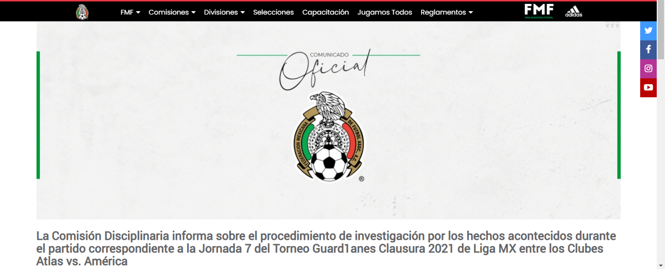 “Se considera culpable al Club América de infringir el artículo 27 inciso a) del Reglamento de Sanciones, en virtud de haber llevado a cabo una alineación indebida durante el partido disputado en contra del Club Atlas, correspondiente a la Jornada 7 del Torneo Guardianes Clausura 2021”, informó la Comisión Disciplinaria.