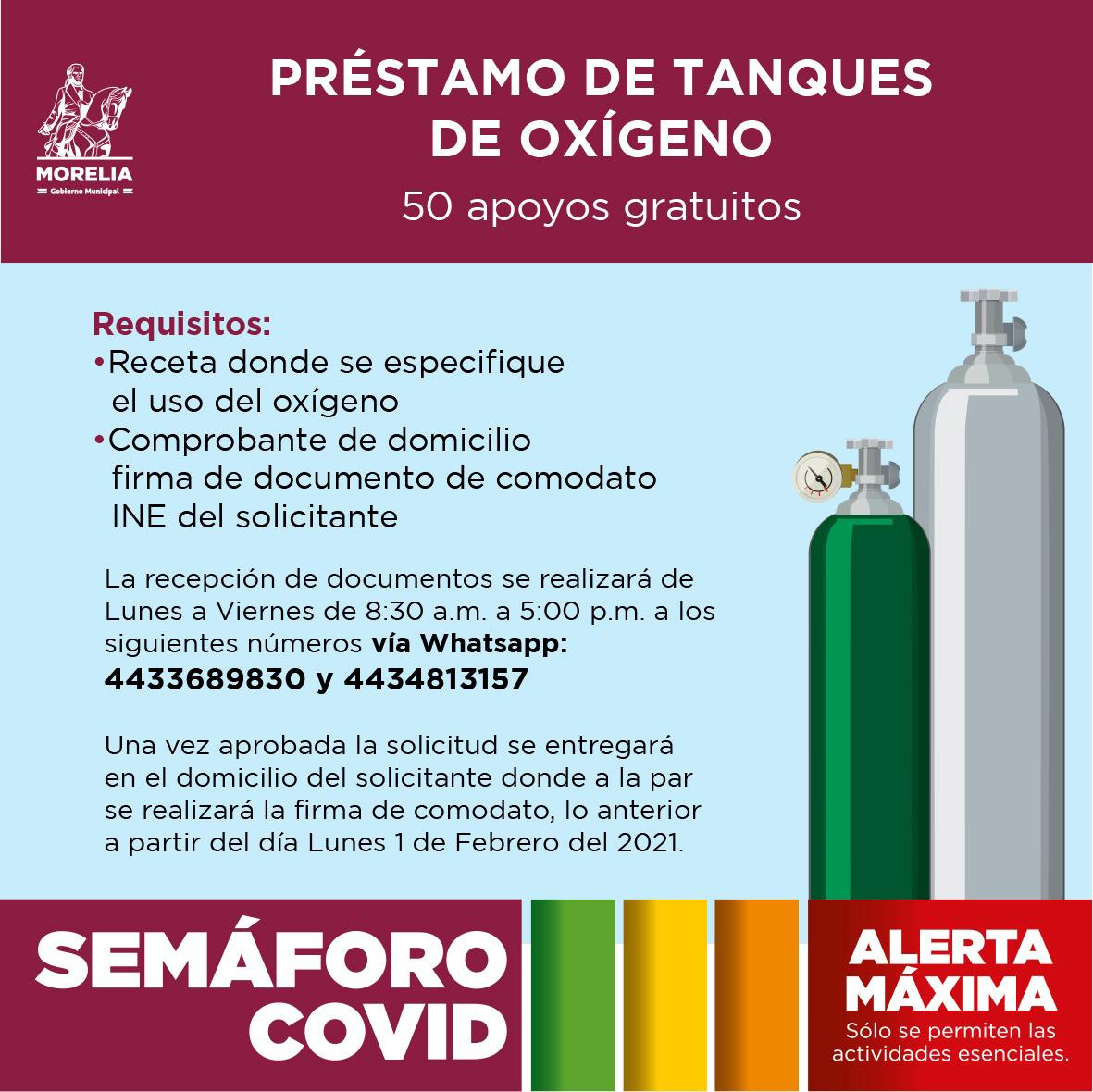 El ayuntamiento de Morelia difundió los requisitos que tendrán que cubrir los interesados en obtener un tanque de los 50 disponibles o una recarga de oxígeno de un total de 4 mil, así como una de las mil pruebas que dispondrá el ayuntamiento para detectar si es portador de COVID-19 en la capital michoacana.