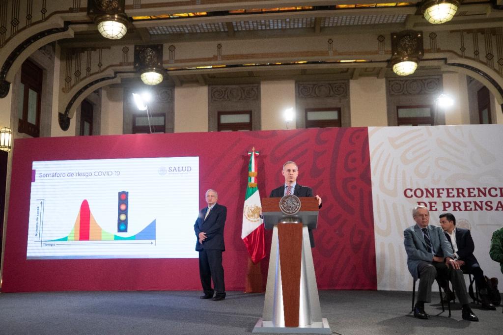 El subsecretario de Promoción y Prevención de la Salud, Hugo López-Gatell Ramírez, presentó el semáforo epidemiológico, en el que el color verde mostrará los lugares que tienen bajo riesgo de contagio y el rojo el de más alto riesgo, mientras amarillo y naranja un riesgo mediano.