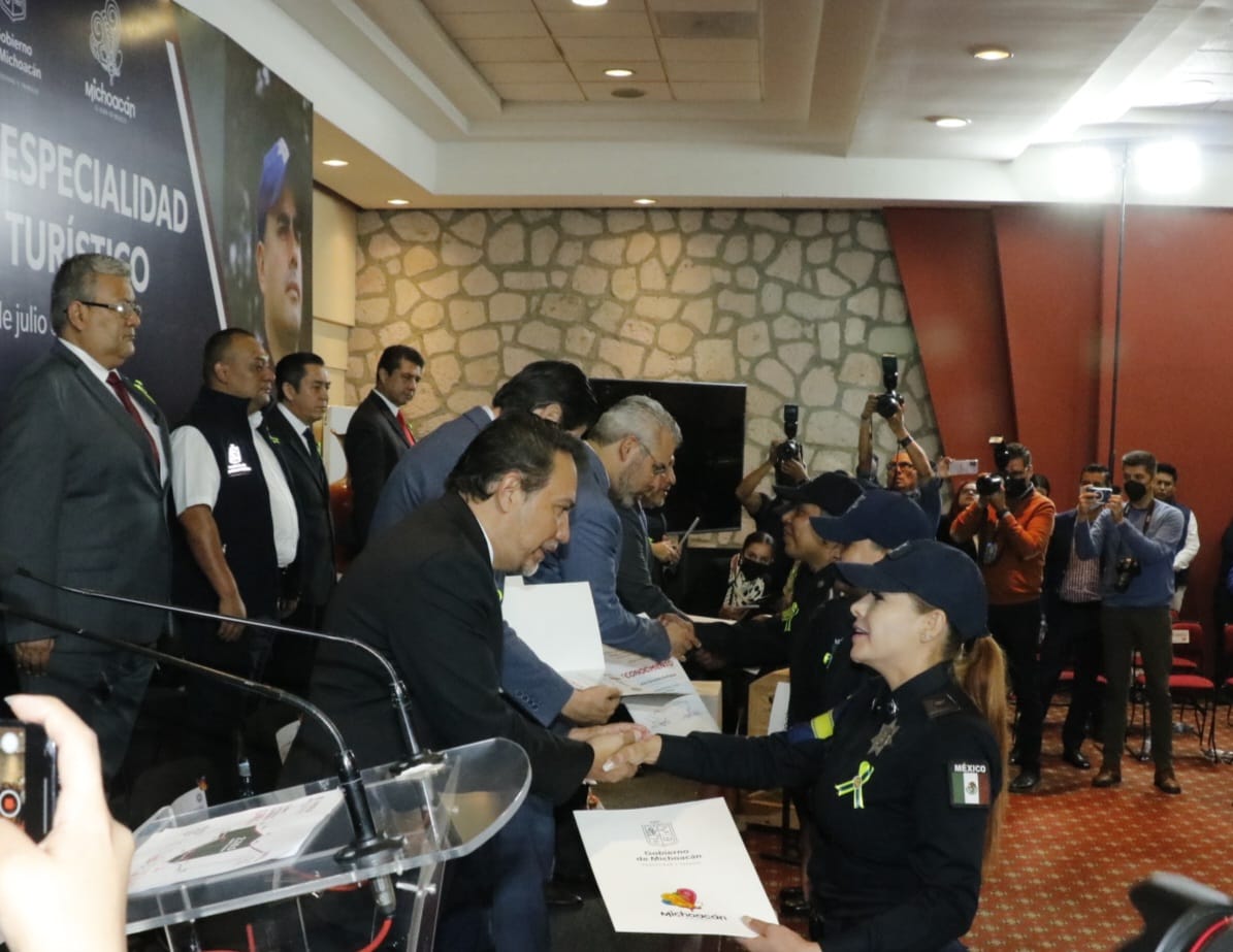 Con 61 policías michoacanos capacitados en historia, cultura, patrimonio histórico, inglés y lengua de señas mexicanas, entrará en operaciones el primer agrupamiento de Policía Turística del estado que recibió de manos del gobernador Alfredo Ramírez Bedolla, las constancias de término de los cursos con los que debieron especializarse para atender a los visitantes.