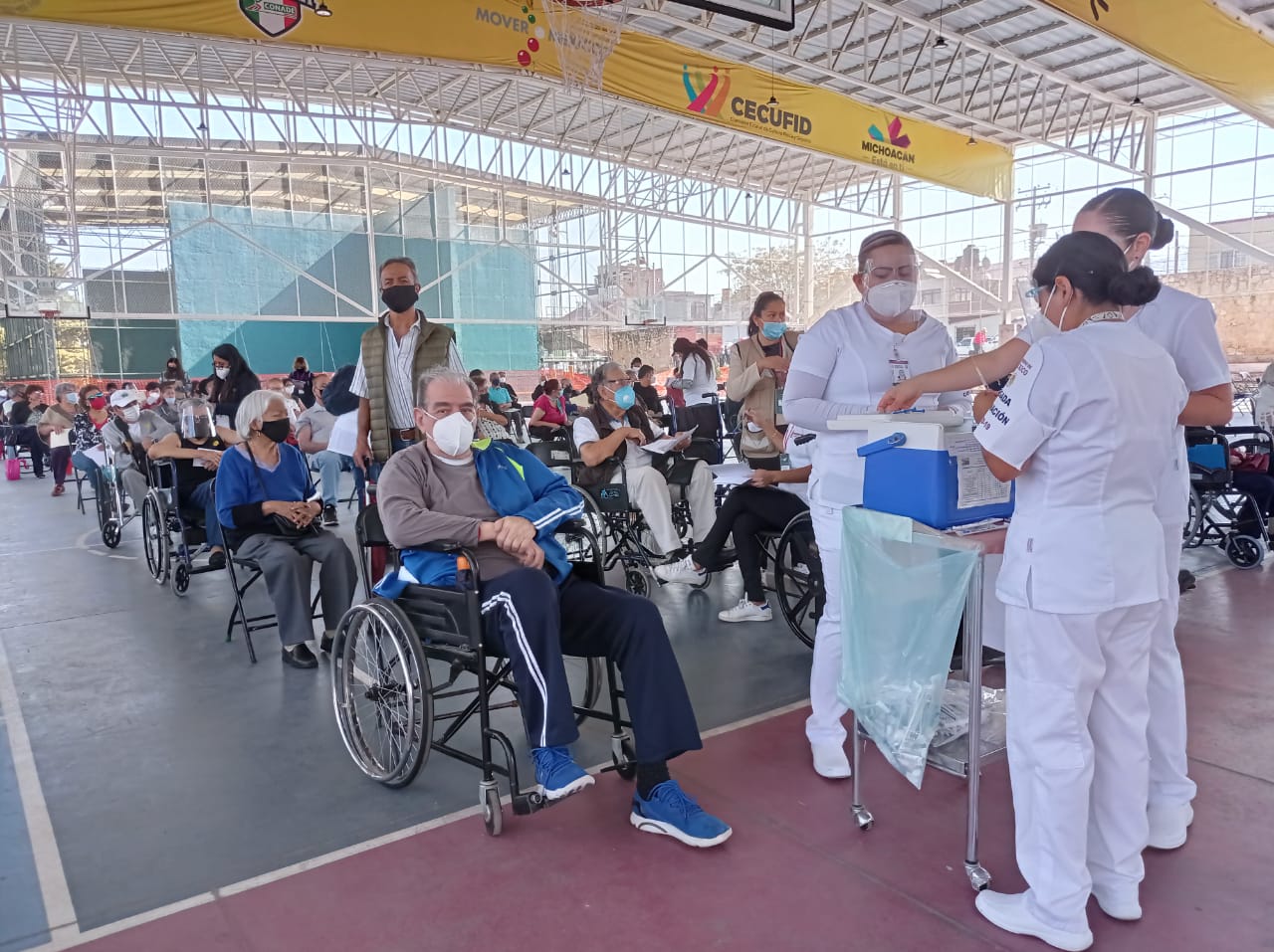 Tras un domingo sin actividad, se retomó la Jornada de Vacunación contra el Covid-19 para los adultos mayores en la capital michoacana, quienes comenzaron su llegada al Centro Deportivo Ejército de la Revolución muy puntuales, algunos con tiempo de anticipación, para que les aplicarán la primera dosis del biológico de Pfizer para ser inmunizados.