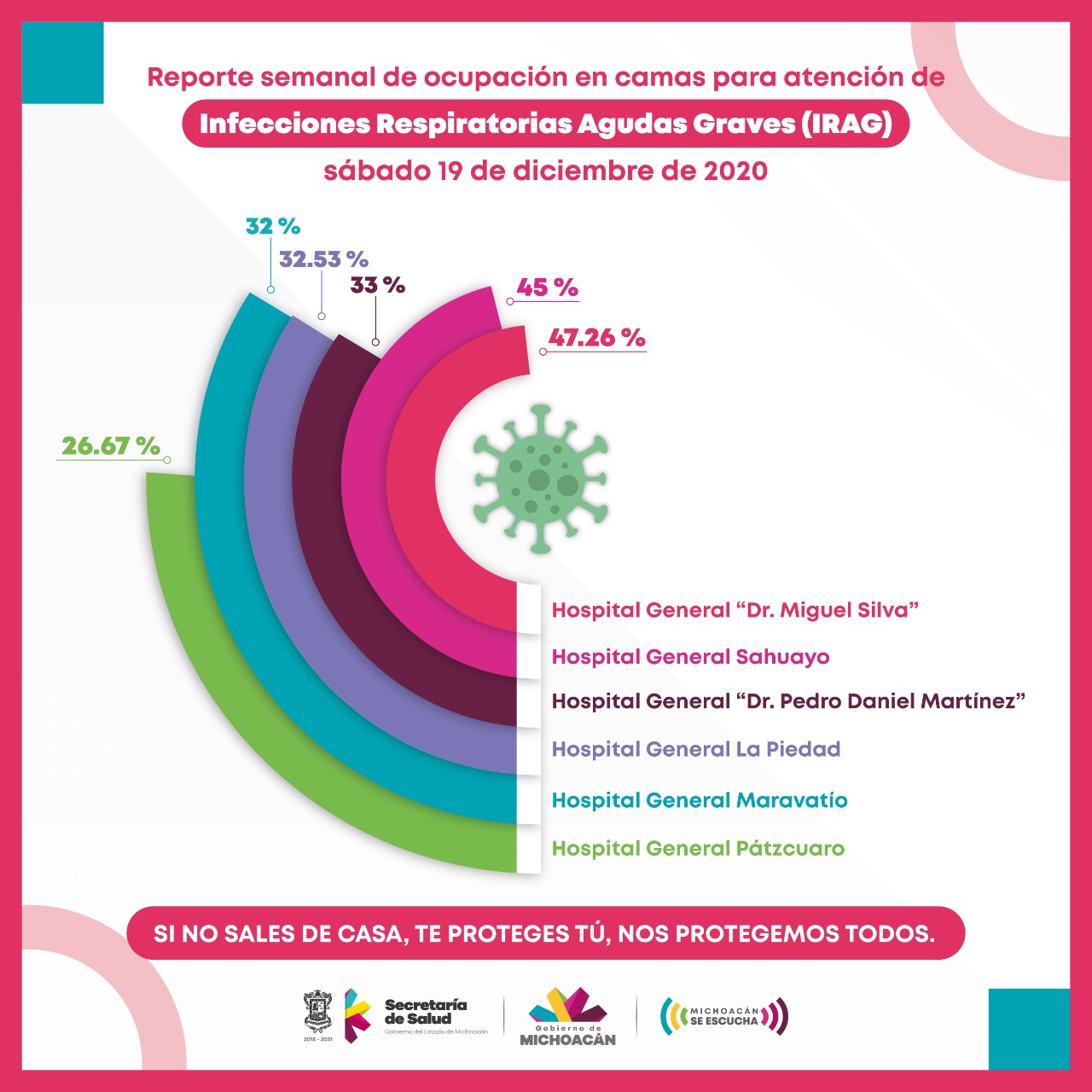 Morelia, Michoacán.- La Secretaría de Salud de Michoacán (SSM), reporta que las camas de seis hospitales reconvertidas para la atención de Infecciones Respiratorias Agudas Graves (IRAG), derivado del comportamiento epidemiológico por COVID-19, se encuentran entre 47.26 26.67 por ciento.
