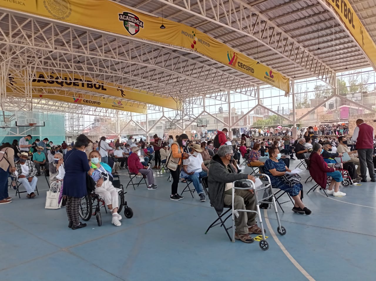 Debido a que del 31 al 4 de abril se suspenderá la Jornada de Vacunación, sin distinción, con cita y sin cita, ciudadanos acudieron este martes a la Unidad Deportiva Ejército de la Revolución.