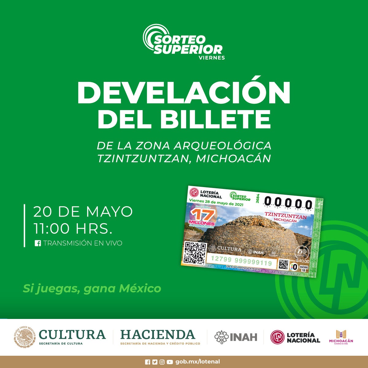 Por medidas sanitarias ante la COVID-19, dicho evento se realizará de manera virtual, a través de las redes sociales de la Lotería Nacional y de la secretaría de Turismo de Michoacán, mañana jueves 20 de mayo, a las 11:00hrs.