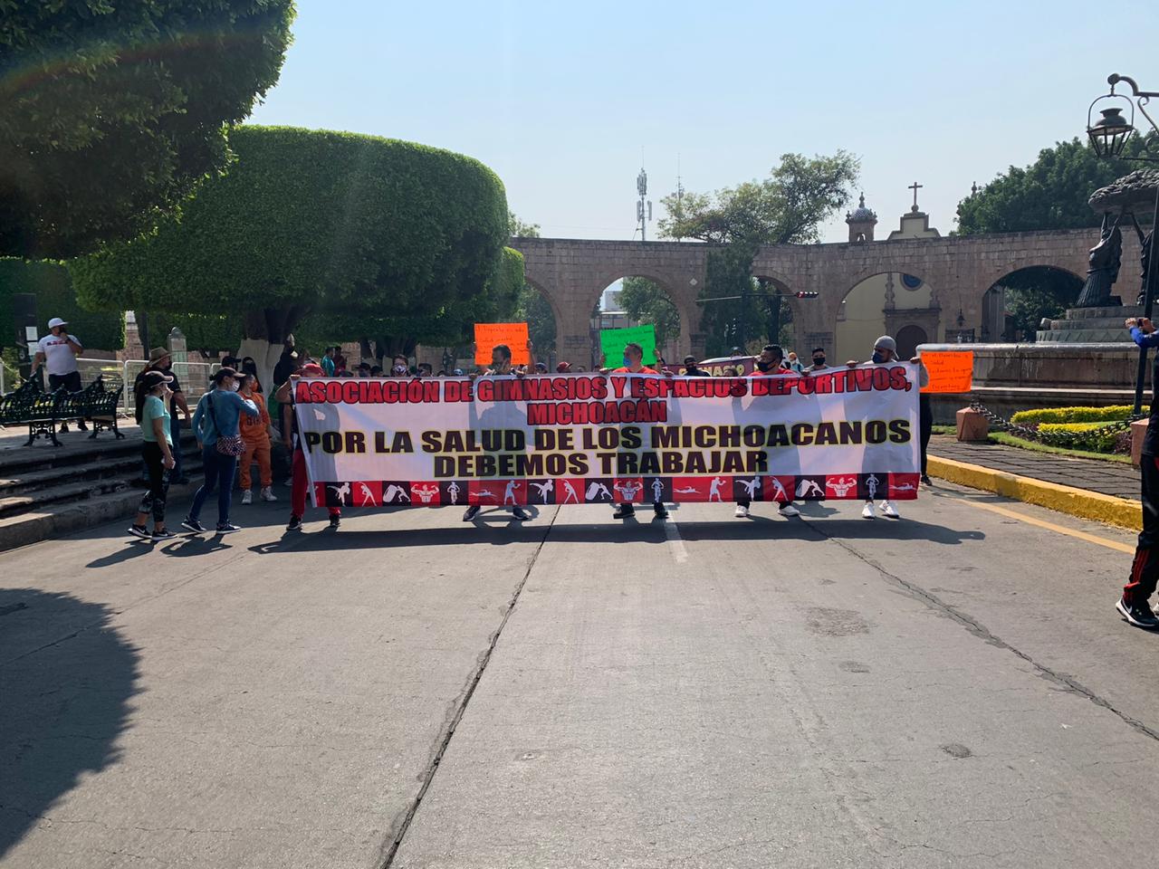 Dueños de diferentes gimnasios de la capital michoacana, marcharon este jueves en la capital michoacana, para pedir a los gobierno estatal y municipal les permitan reabrir sus establecimientos.