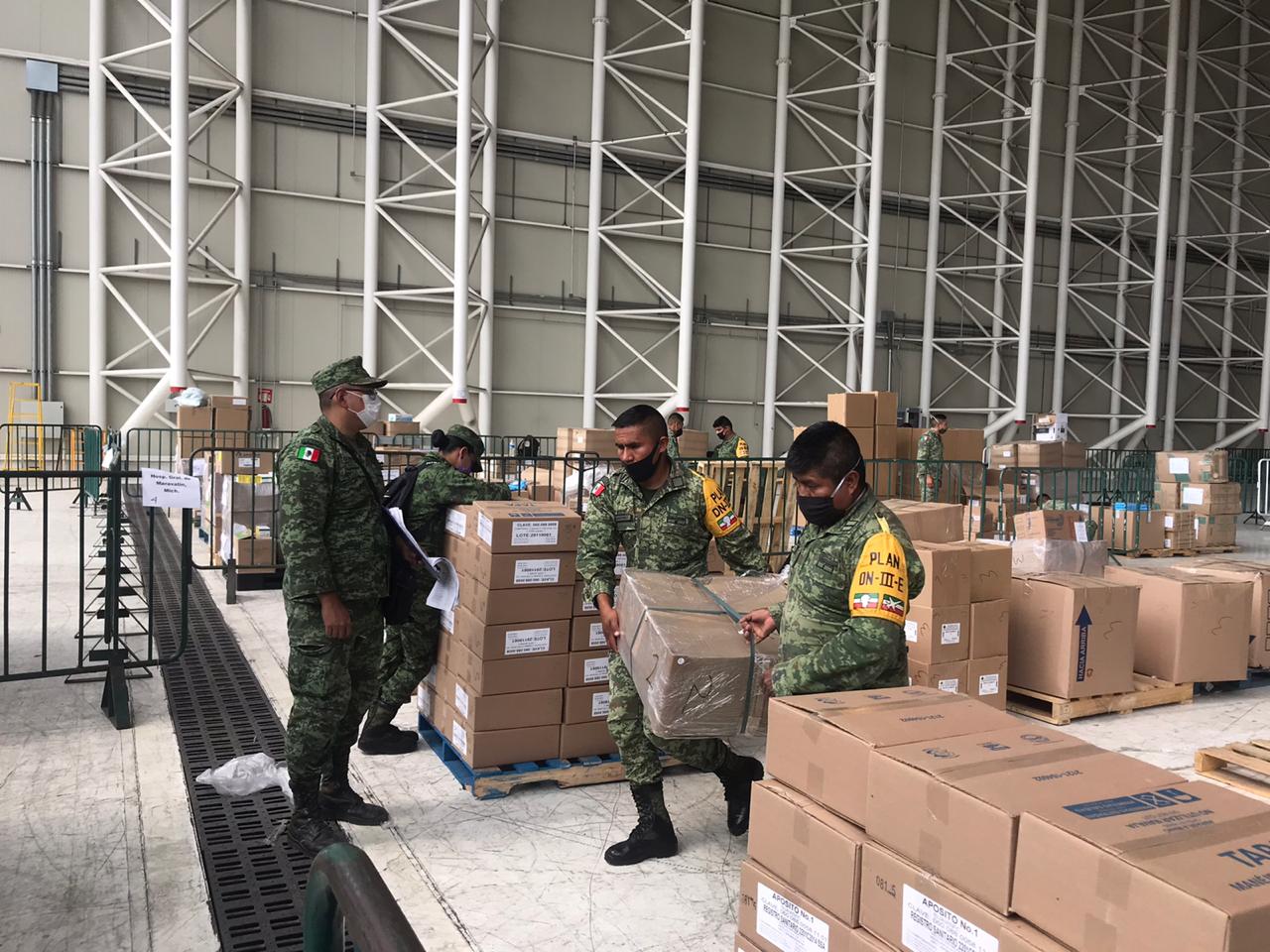 Morelia, Mich.- La Secretaría de la Defensa Nacional informa que como parte de las acciones implementadas por el Gobierno de México con motivo de la contigencia ocasionada por el COVID-19, esta fecha elementos del Ejército y Fuerza Aérea Mexicanos en aplicación al PLAN DN-III-E, trasladarán vía terrestre 90 metros cúbicos de insumos médicos, medicamentos, equipo de protección y mobiliario, a esta ciudad de Morelia, Mich.