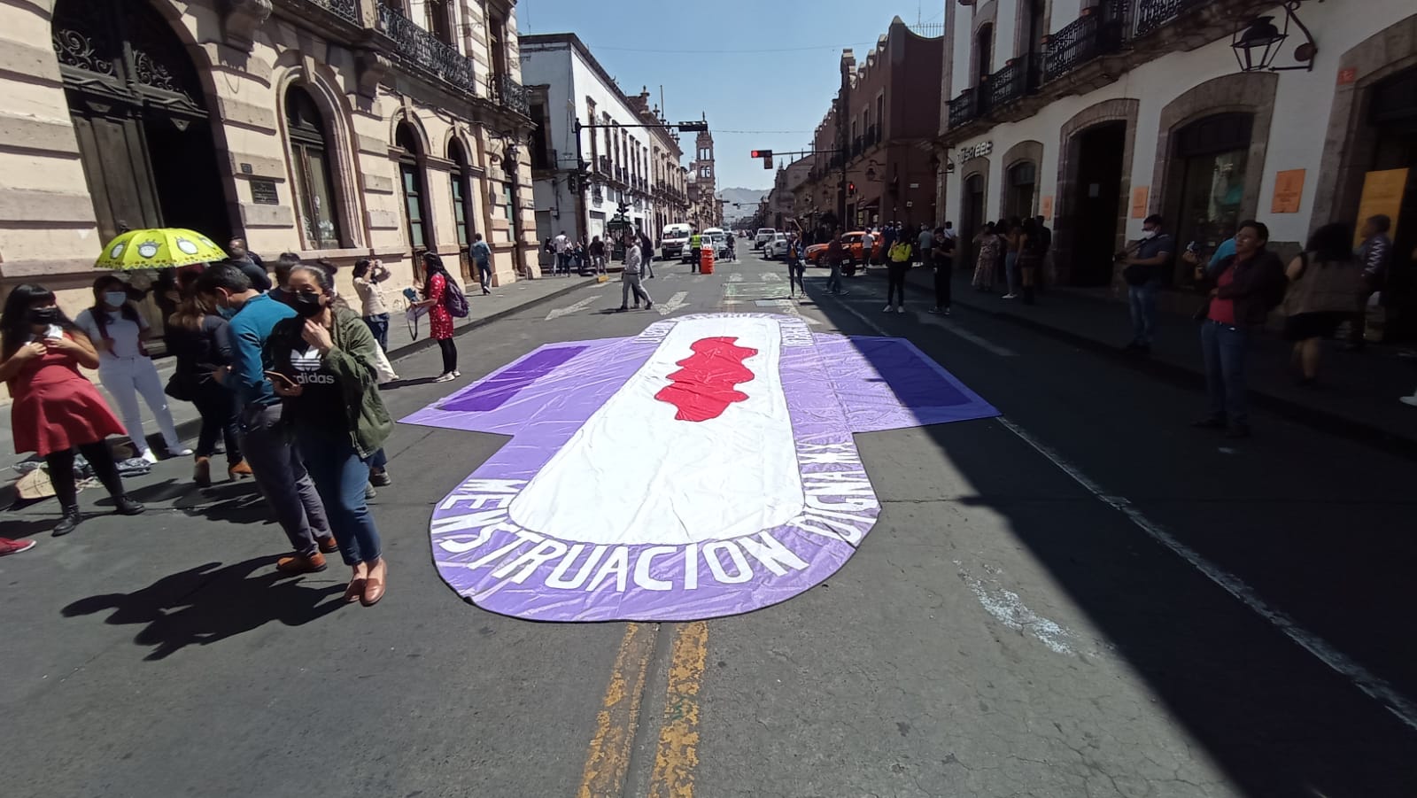 Colectivas feministas, se manifestaron afuera del Congreso del Estado en el centro Histórico de Morelia para demandar la asignación de presupuesto para la implementación de la Ley de Menstruación Digna y con ello, se convierta en un derecho para garantizar que niñas, adolescentes y mujeres accedan gratuitamente a productos de gestión menstrual.