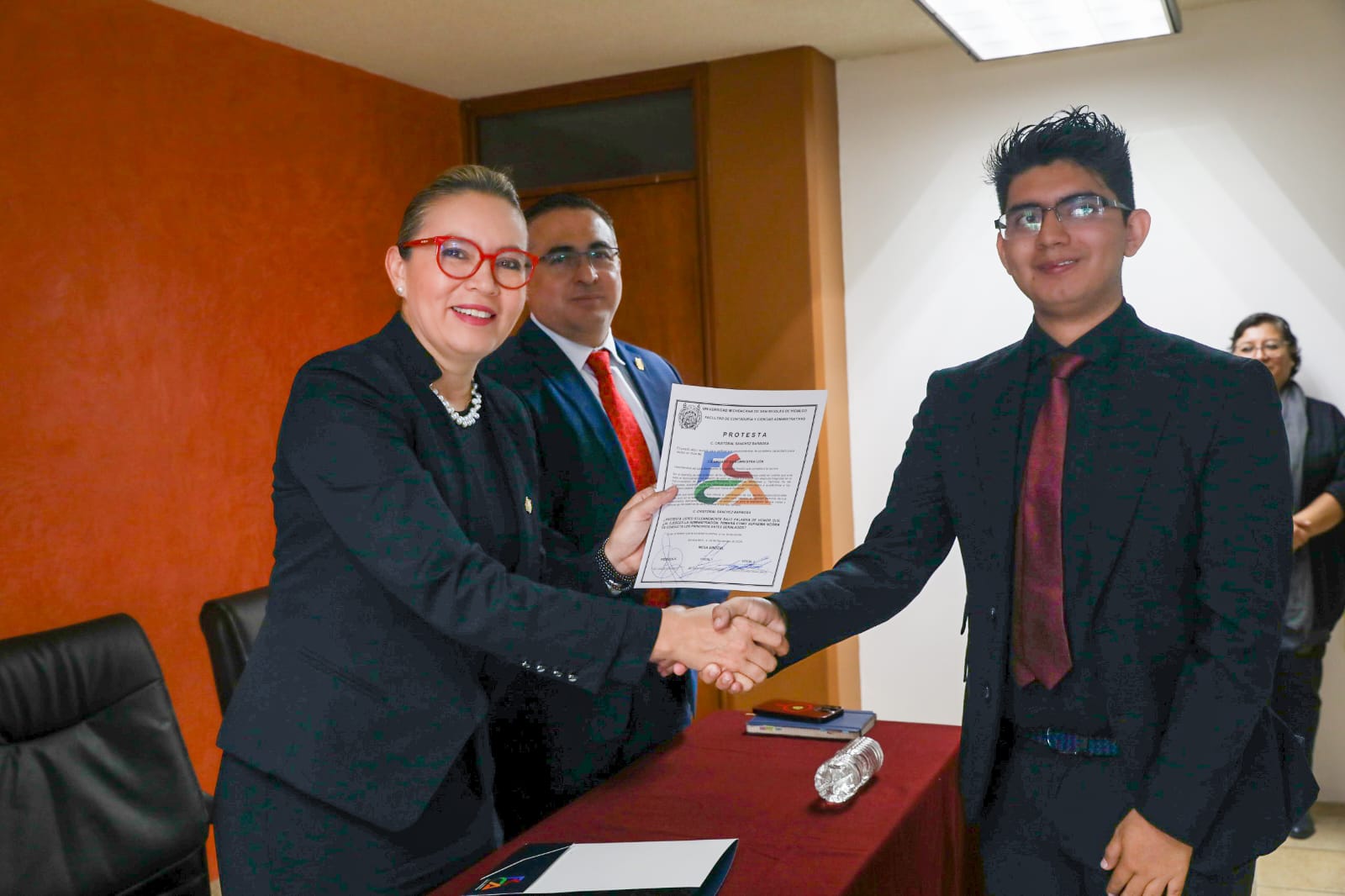 Acompañada por el secretario general, Javier Cervantes Rodríguez y por el tesorero, Enrique Eduardo Román, vocales del Comité, así como por el director de la dependencia, Rigoberto López Escalera, la rectora felicitó a quienes hoy rindieron protesta como Licenciados en Administración y en Mercadotecnia y que se caracterizaron por tener calificaciones de excelencia durante el trayecto de su carrera.