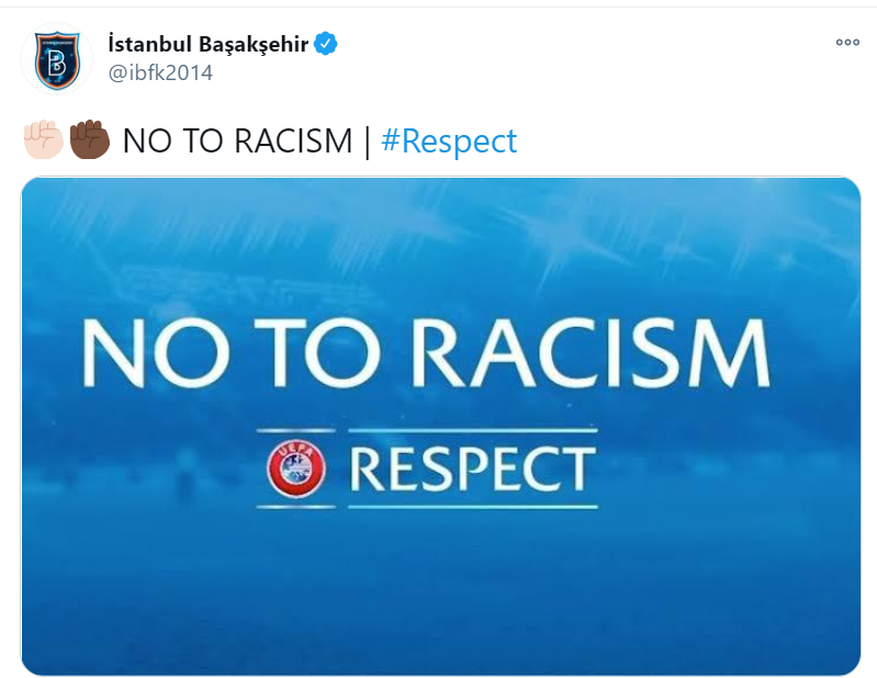 En su cuenta de Twitter el equipo del Istanbul, publicó una imagen con la leyenda de “No to Racism” y de momento la UEFA no se ha pronunciado al respecto.
