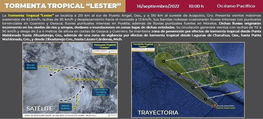 Morelia, Michoacán, La Secretaría de Gobierno, a través de la Coordinación Estatal de Protección Civil invita a la población a tomar medidas de previsión ante la llegada de la Tormenta Tropical “Lester”.