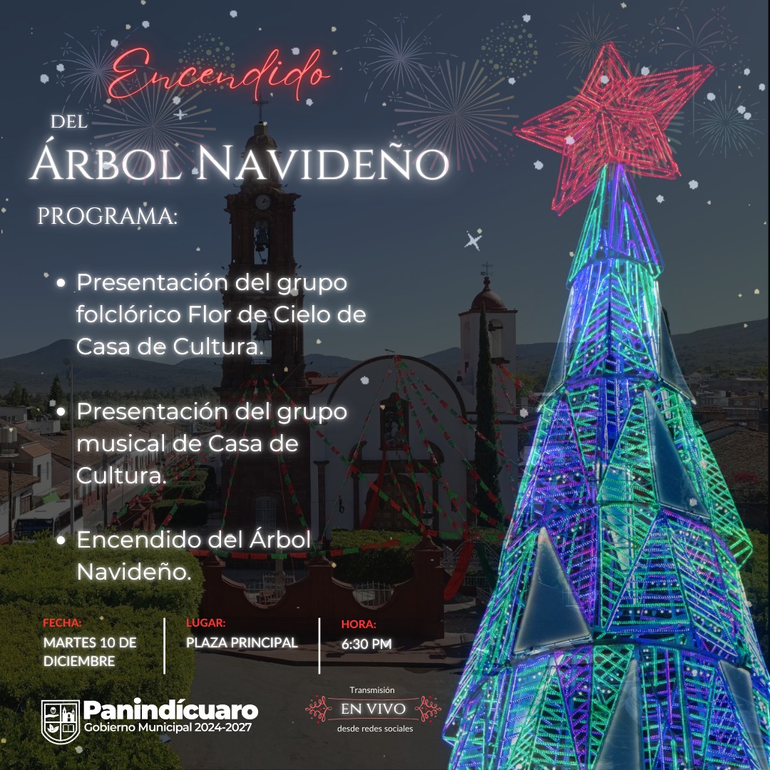 La magia de la Navidad llegó oficialmente a Panindícuaro con el encendido del árbol navideño en la plaza principal. El evento es organizado por el Honorable H. Ayuntamiento de Panindícuaro bajo la presidencia del Lic. Manuel López Meléndez atreves de la Dirección de Educación, Cultura y Turismo.