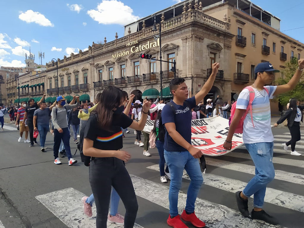 Entre consignas y mantas, la movilización avanzó hasta el centro histórico alrededor de las 3 de la tarde, enloqueciendo las vialidades, hasta llegar al Palacio de Gobierno, donde ya los esperaba un templete, por lo que concluyeron con un mitin político.
