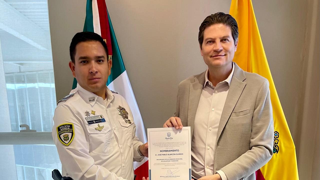 Morelia, Michoacán.- Con un llamado a redoblar el paso, fortalecer la seguridad, inhibir el delito y atender las demandas ciudadanas, el presidente municipal de Morelia Alfonso Martínez Alcázar, entregó al Comisario Pablo Alarcón Olmedo, el nombramiento que lo acredita como Encargado del Despacho de la Comisión Municipal de Seguridad Ciudadana.