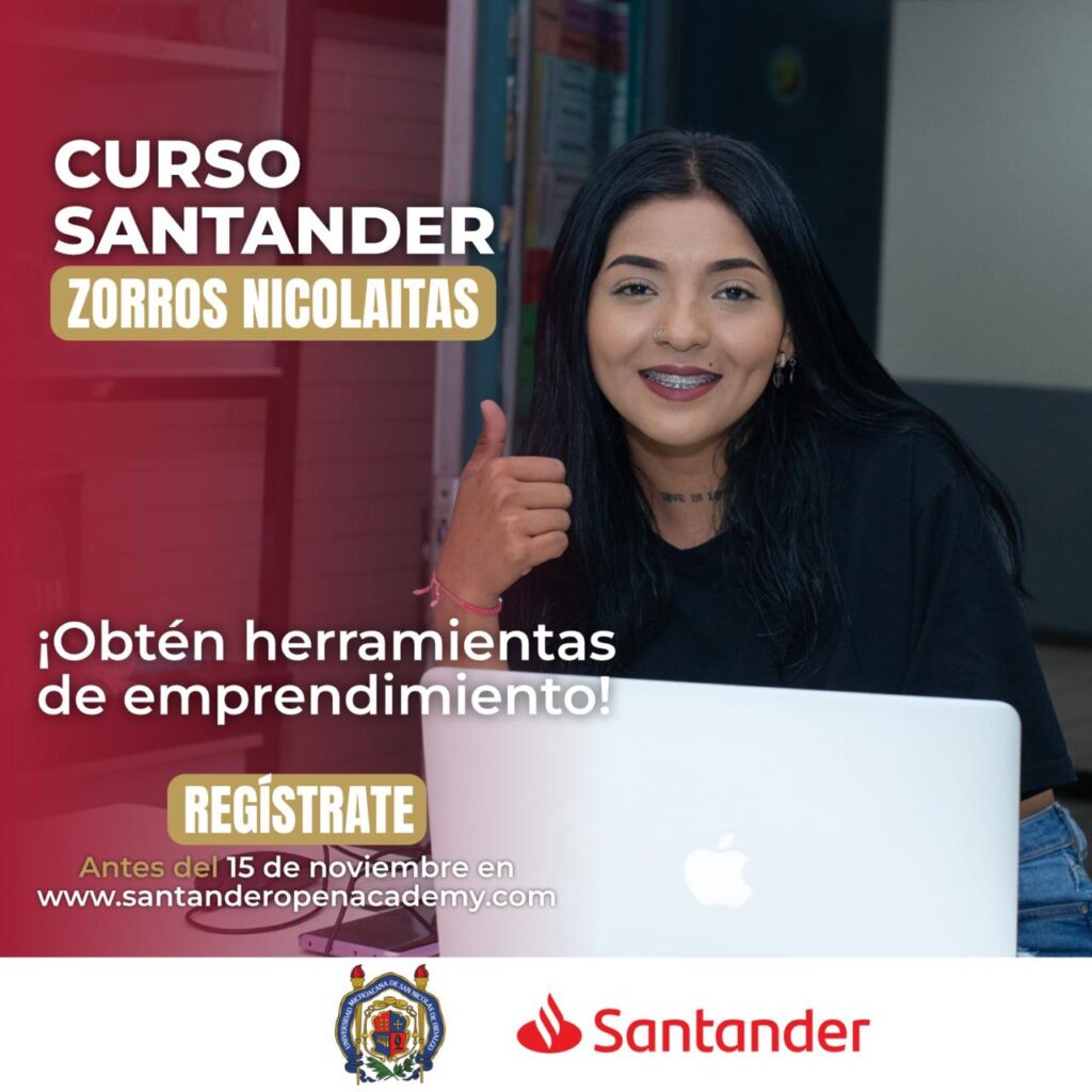 Morelia, Michoacán.– Con el fin de ofrecer actividades complementarias para fortalecer las competencias profesionales y mejorar la formación y empleabilidad de la comunidad docente, administrativa y estudiantil, la Universidad Michoacana de San Nicolás de Hidalgo (UMSNH) invita a participar en los Cursos Santander “Zorros Nicolaitas”, que se brindan a través de la alianza con Banco Santander.