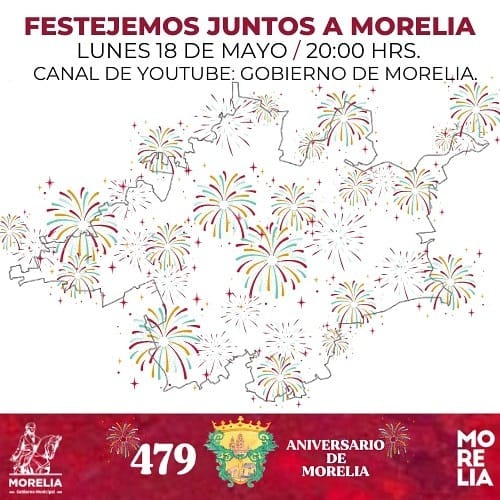 Por motivos del 479 aniversario de la fundación de Morelia, el ayuntamiento a través de la secretaría de Turismo festejará el lunes 18 de mayo a partir de las 20:00 con un espectáculo de pirotecnia en 30 puntos distribuidos en toda la ciudad y sus tenencias; lo cual señala un comunicado de dicha dependencia, se podrá admirar desde las azoteas de los morelianos o en plataformas virtuales, con el fin de no corromper la sana distancia en el municipio.