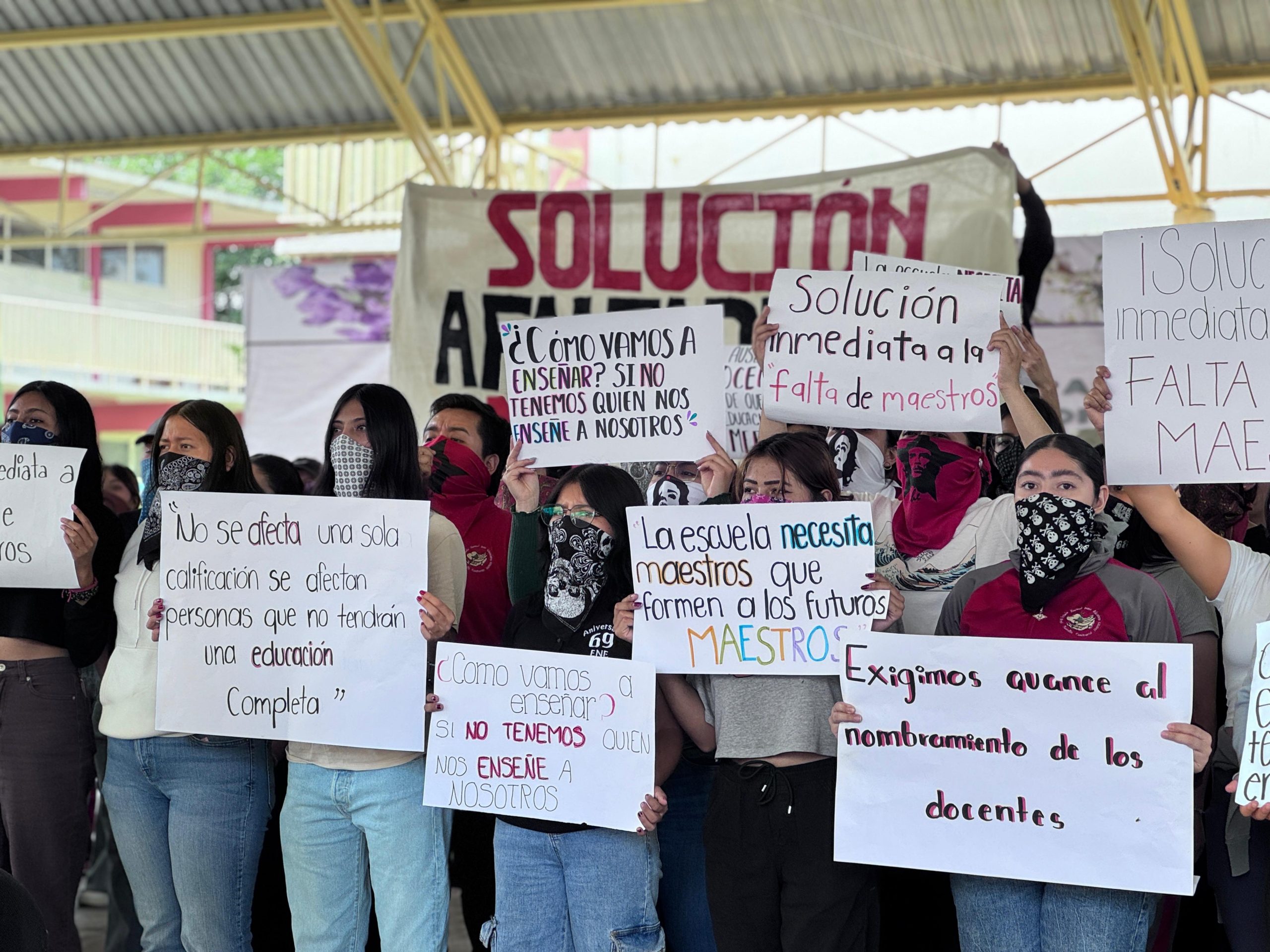 Las manifestantes señalaron que la ausencia de profesores en materias clave como Planeación de la enseñanza, Equidad y Perspectiva de Género en preescolar, Didáctica del pensamiento numérico, Pensamiento científico y cultura ambiental, así como Cultura y lengua originaria Purépecha, ha afectado su formación académica.