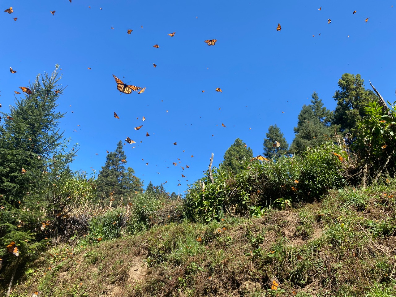 En estos días, debido al cambio de clima, el rayo del sol ayuda a que las mariposas salgan del letargo para bajar a los riachuelos o cuerpos de agua, donde se pueden observar por cientos. De igual forma revolotean cerca de los senderos que recorren los visitantes, y no permanecen perchadas en los arboles de oyamel como cuando comienza la temporada.