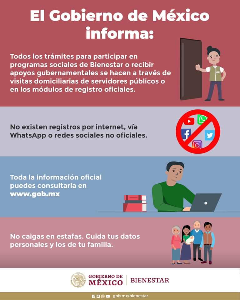 Cabe señalar que el trámite para incorporarse a los Programas Integrales de Bienestar no puede hacerse por internet y mucho menos se pide proporcionar contactos o dinero para realizarlo. Únicamente es mediante visitas a domicilio de servidores públicos perfectamente identificados, o bien en los módulos de registro oficiales, sin costo alguno para la población.