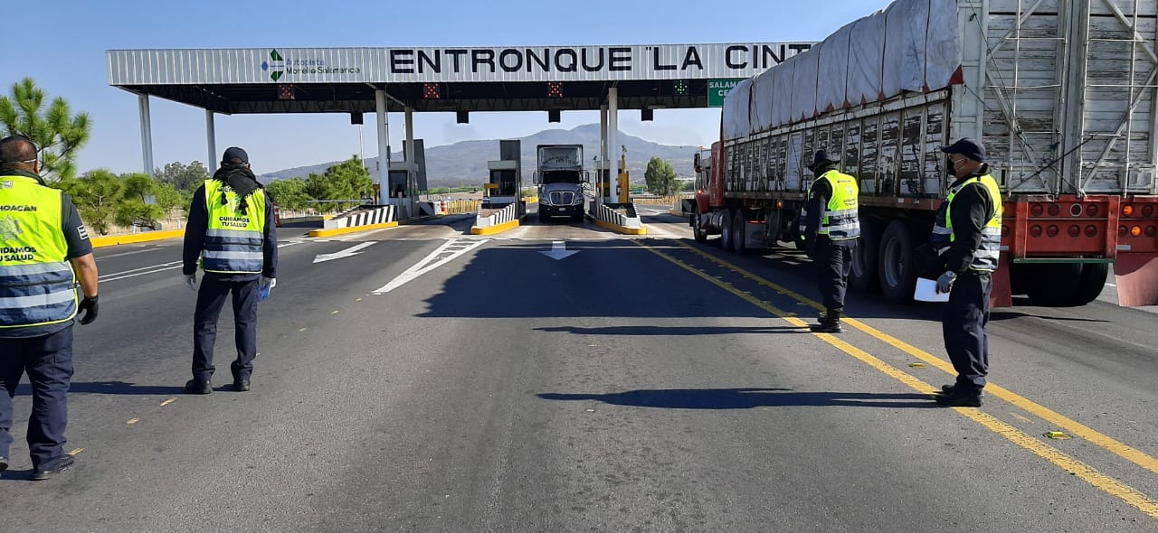 Sin la participación de personal de salud, elementos de seguridad federales y estatales instalaron este viernes el filtro de información sobre el COVID-19 en el entronque “La cinta”, en la autopista Morelia-Salamanca que une a Michoacán con Guanajuato.