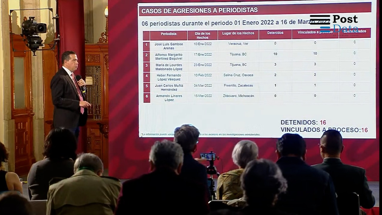 Durante el informe que presentó el funcionario federal, especificó que del 01 de enero al 17 de marzo del 2022, se reportaron 6 periodistas asesinados: José Luis Gamboa Arenas, asesinado el 10 de enero en Veracruz; Alfonso Margarito Martínez Esquivel privado de la vida el 17 de enero en Tijuana, Baja California; María de Lourdes Maldonado López asesinada el 23 de enero en Tijuana, Baja California; Heber Fernando López Vázquez, asesinado el 10 de febrero en Salina Cruz, Oaxaca; Juan Carlos Muñiz Hernández privado de la vida el 04 de marzo en Fresnillo, Zacatecas y Armando Linares López asesinado el 15 de marzo en Zitácuaro, Michoacán.