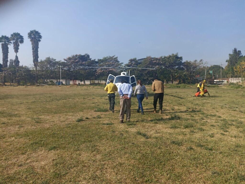Uruapan, Michoacán.- Desde esta mañana arribó a Uruapan el helicóptero con helibalde del Gobierno de Michoacán para atender el incendio forestal que se registra en el área de montaña del Parque Nacional Barranca del Cupatitzio.