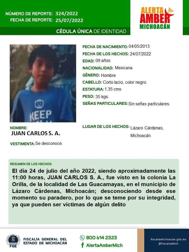 Durante una acción operativa implementada en la carretera conocida como Complejo Siderúrgico, Las Truchas, agentes de la Policía de Investigación observaron a un niño mientras caminaba, y al corroborar que se trataba de J.C.S.A., lo aseguraron y trasladaron a las instalaciones de la institución, donde confirmaron que el motivo de su ausencia fue por motivos personales, por lo que fue desactivada la alerta.